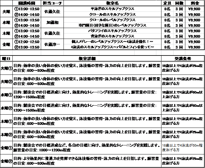 *各クラス、先着順に予約を承り定員に到達次第、募集を締め切らせて頂きます。